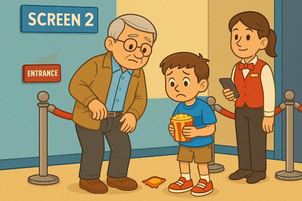 At the cinema, his grandpa bought two blue tickets and some cheese to eat. Peter also wanted some popcorn, so they bought a small box. The cinema was big and busy, with posters of animals and superheroes on the wall.