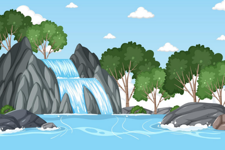 A waterfall is a beautiful place a river falls down from a high place. You can often find them in mountains or in forest. A waterfall makes a very loud and exciting sound when the water falls. a sunny day, you can sometimes see a beautiful rainbow in the air at the waterfall. A rainbow has got colours, like red, yellow, and blue. It looks amazing. When you go to see a waterfall, it is very important to be safe. The ground near the water can be wet, and you must careful not to fall.