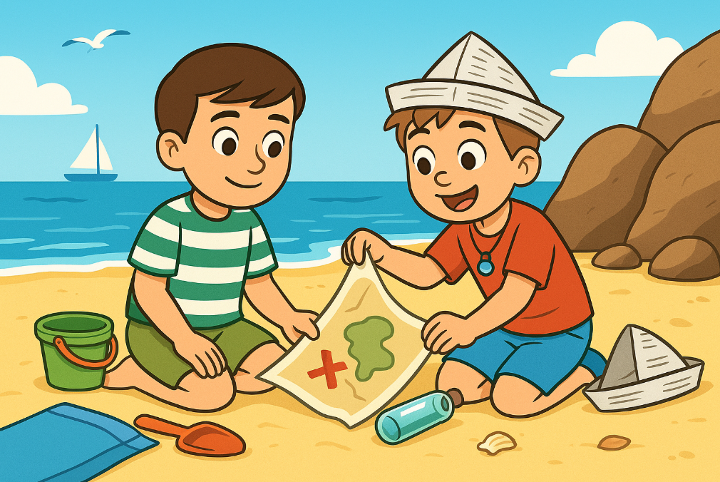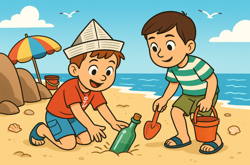 They walked along the beach because they wanted to find treasure. Near some big rocks, they saw an old bottle in the sand.