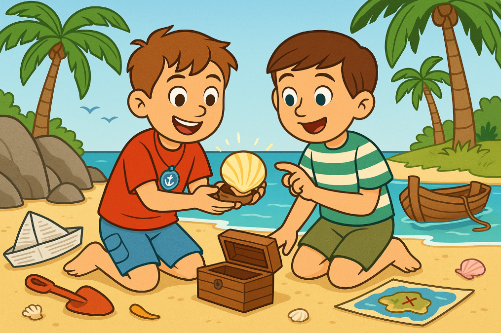 They sailed to the island and found the big X on the map. They started to dig in the sand, and soon, they found a small, old box. Inside was a beautiful round shell.