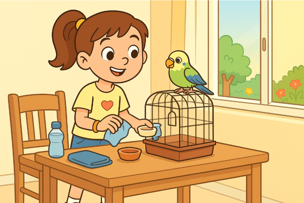One sunny afternoon, Zoe cleaned Pip’s cage in the kitchen. She took out the toys and water bowl to wash them.