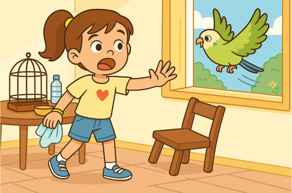 Then, Pip moved his wings and flew out of the cage - through the open kitchen window!