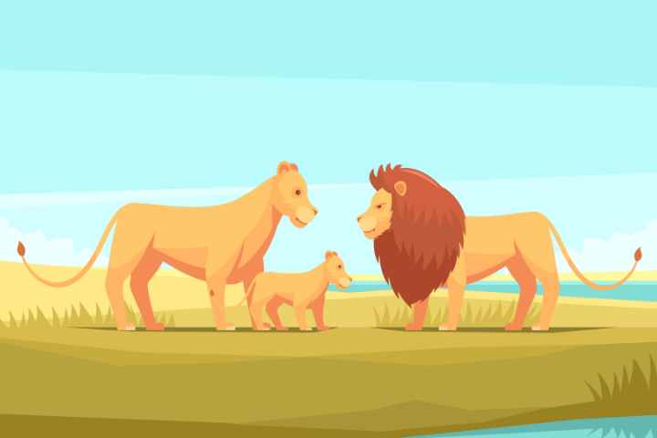 A lion is a very big and strong animal. has got a yellow and brown body and a long tail. The father lion is very beautiful. He has got long hair on his head and neck. The mother lion hasn't got this. She is smaller the father lion. Lions don't live in the jungle. They live in dry, hot places there is tall grass. Lions must meat to live. They often catch big animals like zebras. Lions live in a group. When they catch animal, all the lions in the group eat the food.