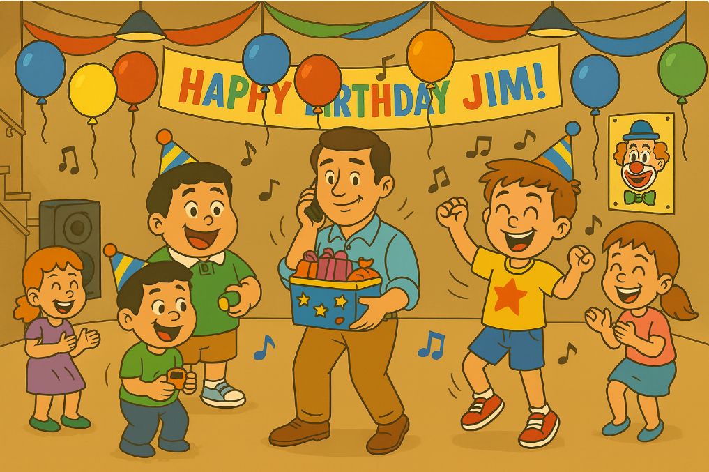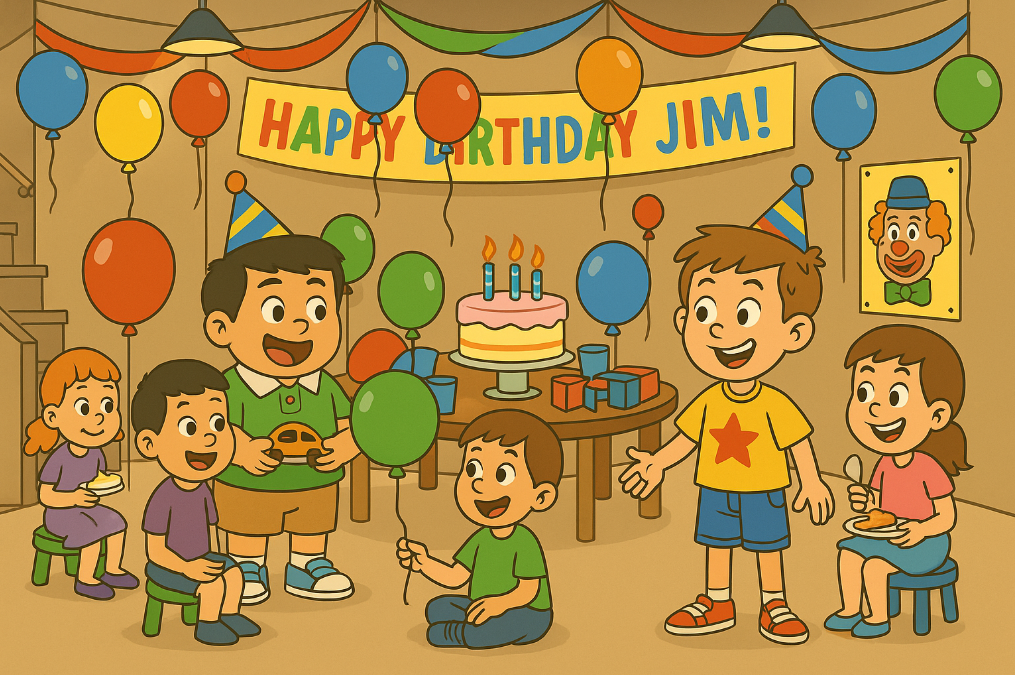 On Saturday, it was Jim’s birthday. His parents had a big party for him in the basement. All of Jim’s friends were there, and he was very happy because there was a clown show at his party.