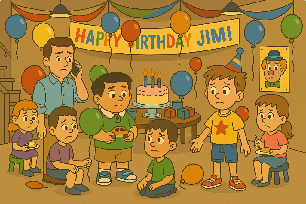 Jim’s dad looked sad. 'I’m so sorry, Jim,' he said. 'The clown has a bad cough, and he can’t come to the party.'