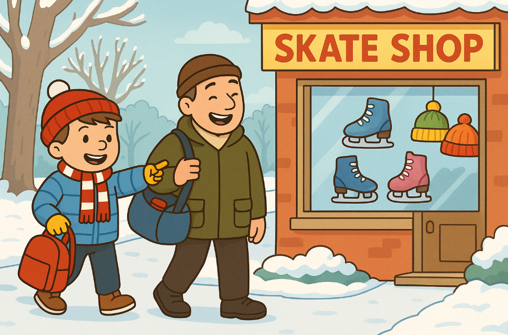 His dad laughed. 'Yes, and we shouldn't forget the skates again!'