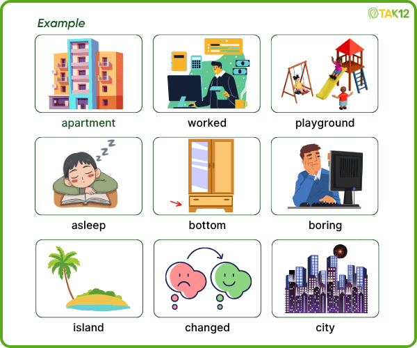 Look and read. Choose the correct words and write them in the blanks. There is one example.
