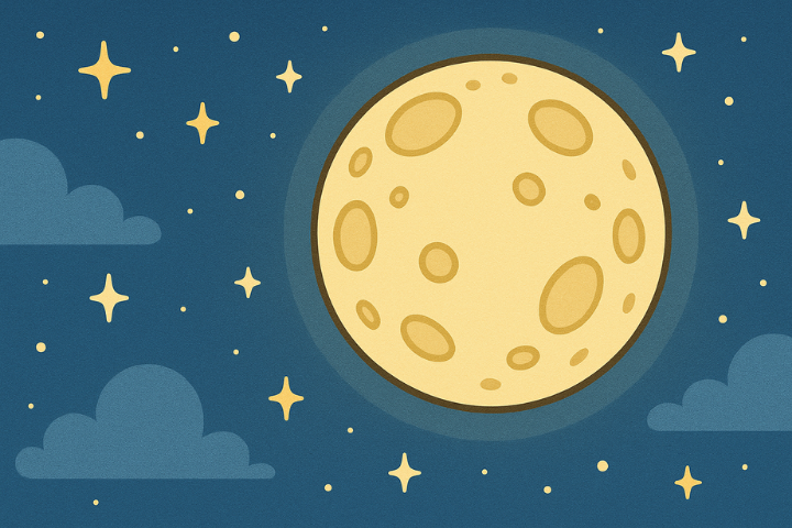 The moon is a big, round thing you can see in the sky at night. The moon make its light. The sun's light is on it. The moon changes its shape every few days. Sometimes, the moon is like a big circle. On other nights, you can see a part of the moon. It can be thin like a banana. Sometimes, we can't see the moon at all. People like looking the moon before they go to bed. Do you watching it?