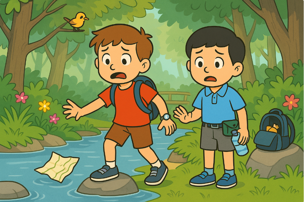 They walked on a small road for an hour. The forest was beautiful, with many birds and flowers. But when they went into a small river, Leo hit a rock. The map fell into the water and went away.