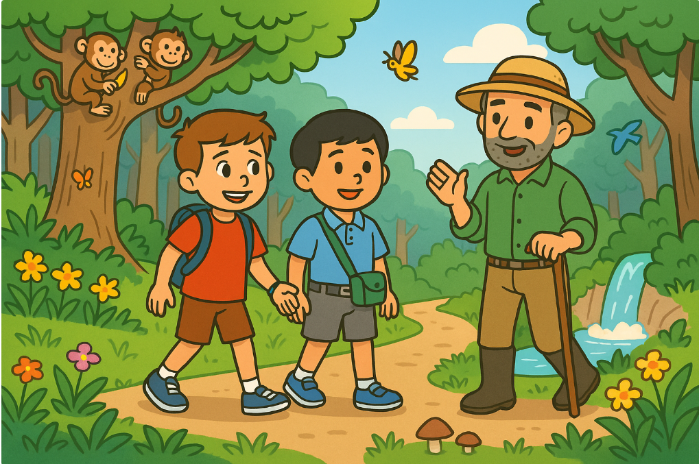 He took them to a beautiful road with flowers, birds, and a small waterfall. There were some monkeys in the trees. Soon, they were back at the first stop of their trip.
