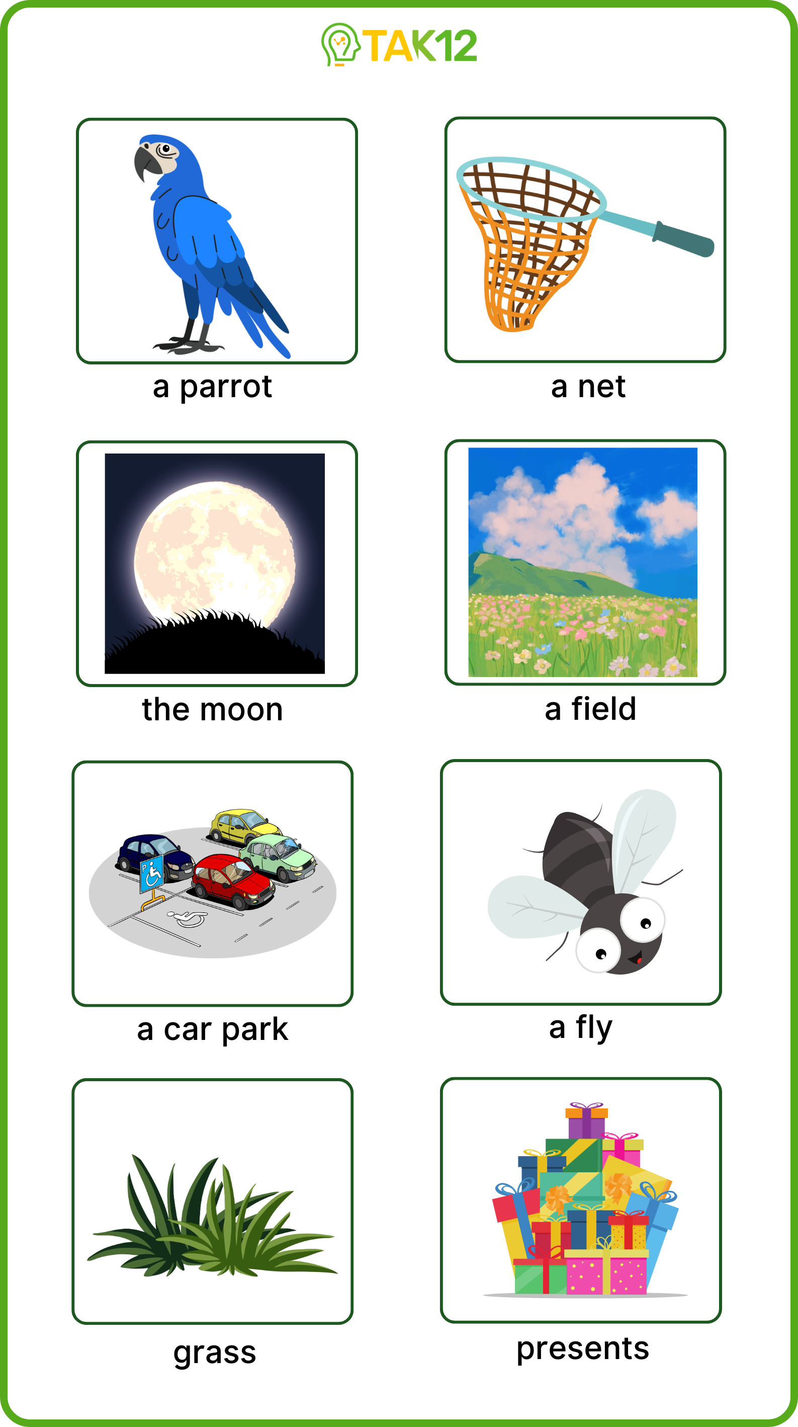 Read the story. Choose a word from the box. Write the correct word next to numbers 1-5. There is one example.