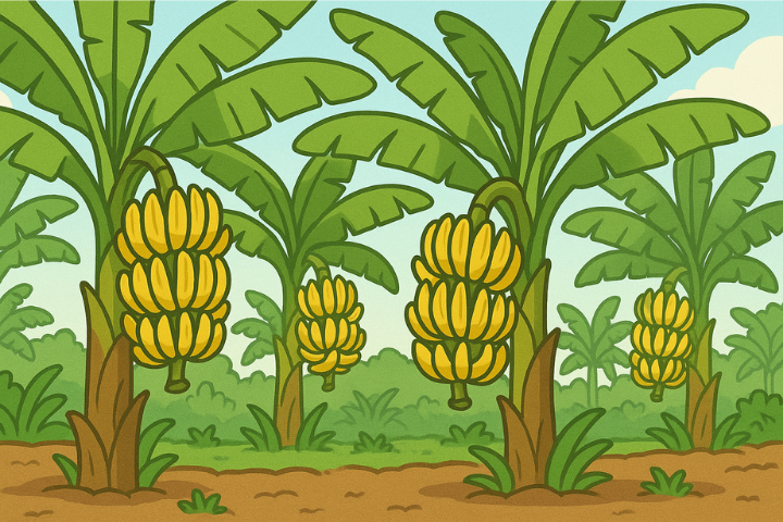 Bananas are yellow fruits grow in hot countries. They grow together in big groups on tall plants. When bananas are green, you can't eat them. But when bananas are yellow, they are sweet and very nice to . You can eat bananas breakfast, lunch, or dinner. Some people put them in cakes or make banana milkshakes. children like bananas and often take them to school. Monkeys love bananas too! You often see funny pictures of monkeys with bananas in books on TV.