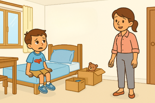 Sam sat on the bed and looked at the white wall. He wanted to have a picture of cars or tigers. He didn't think his new room was very fun. He was very sad.