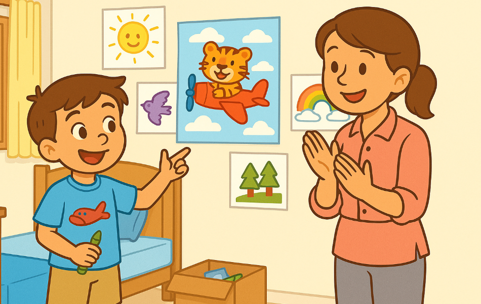 His room didn’t look white and boring anymore. It looked fun! 'This is the best wall in the world!' smiled Sam.
