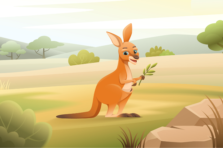 A kangaroo is a famous animal that live only a big, hot country. A kangaroo has got two very big and strong back legs and two smaller front legs that are like arms. It has got a very long, strong tail too. A kangaroo's head is small, it has got big ears. Kangaroos do walk or run. They hop on their back legs. Kangaroos are animals eat only plants. They like grass and leaves. They often eat in the morning or in the evening when it is not very hot.