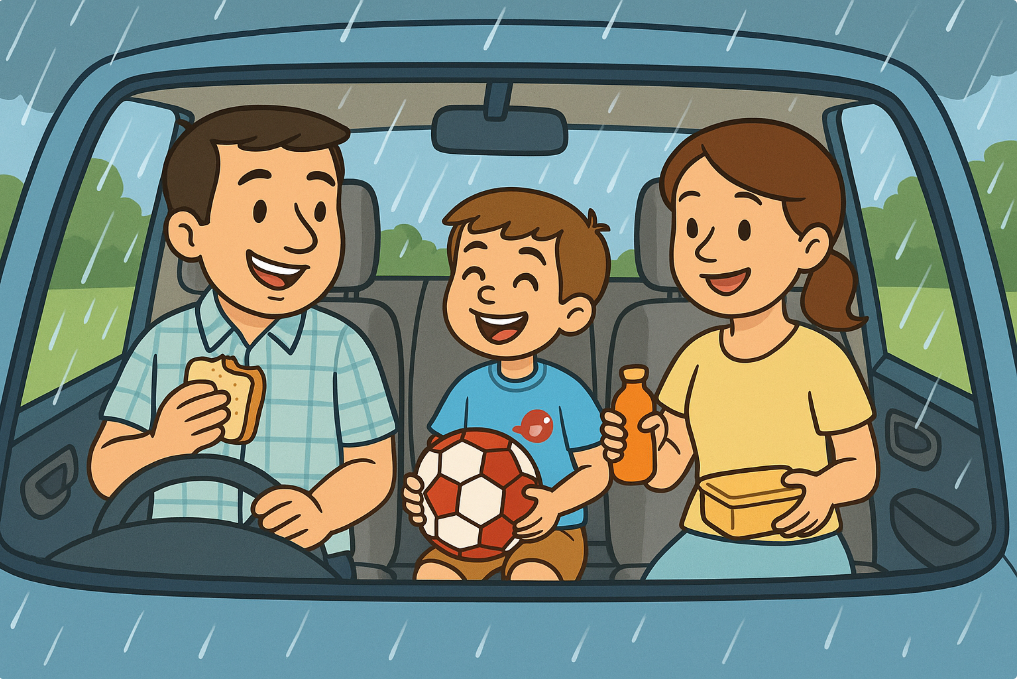 They all ran inside the car. Mum took out the food, and Dad turned on the radio. They laughed and talked while the rain fell outside.