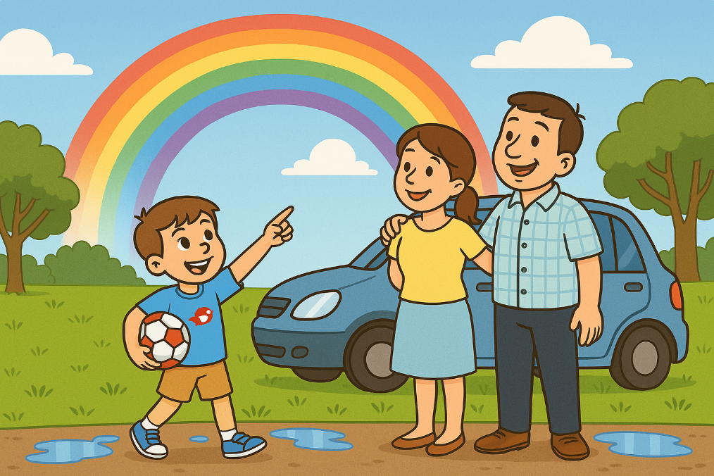 They ate their sandwiches and sang along to songs on the radio. Then the rain stopped and there was a beautiful rainbow in the sky.