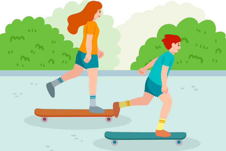 Skateboarding is a sport people do outside. It is also a fun and exciting hobby for boys and girls. You need a skateboard to do this sport. A skateboard is easy to carry. People can take to any place. They can ride a skateboard to go to school or your friends' houses. When people go skateboarding, they must a helmet to stay safe. They stand on the skateboard and put foot on the ground to move it along the street. Many people are good skateboarding. They can even jump and turn in the air!