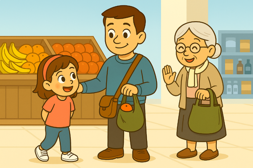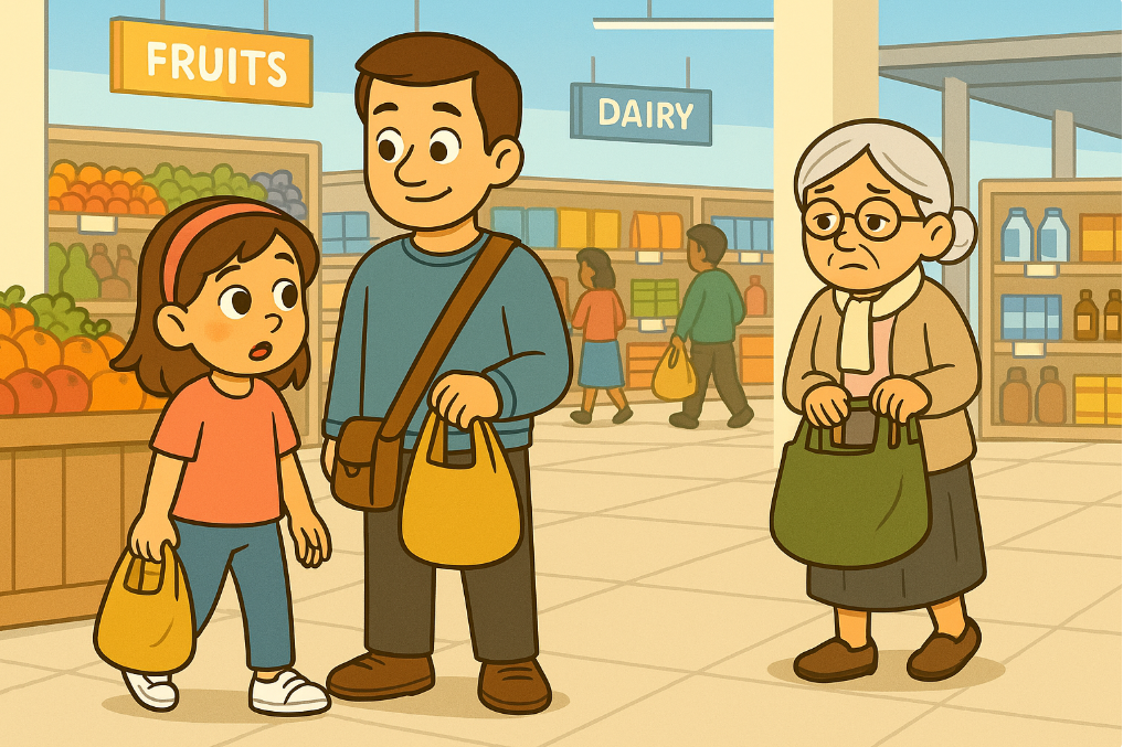 They walked past the fruit when Lily saw an old woman. The woman had white hair and glasses. She carried a big bag. It looked very heavy. The bag was full of shopping.
