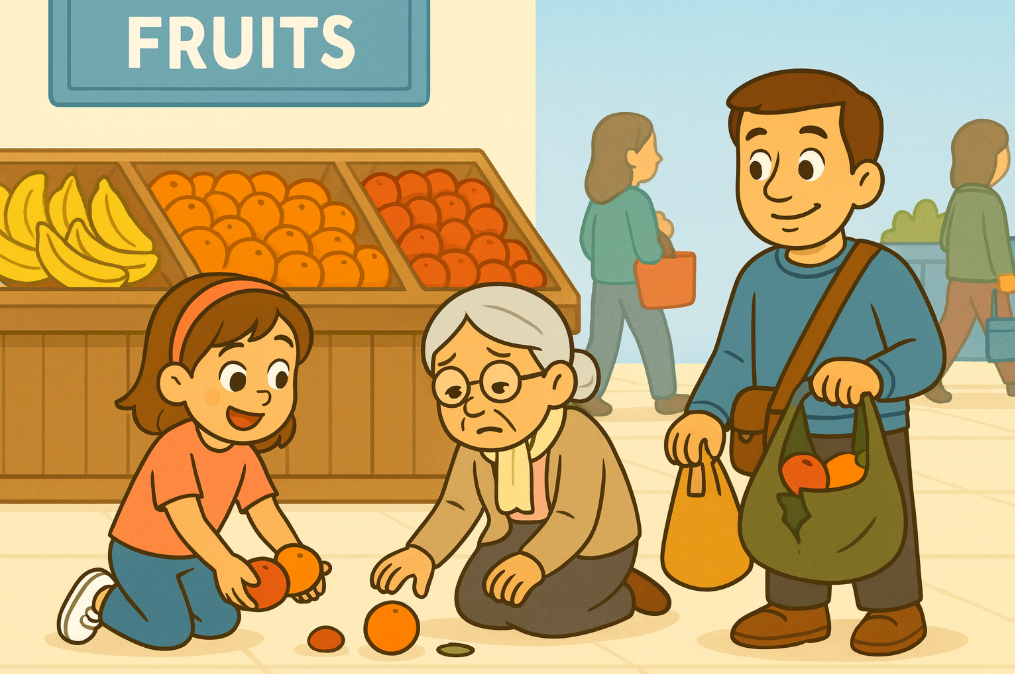 Lily ran to help. 'I can help you,' she said. She picked up the apples and oranges. She was very careful. She put them in her hands. She also got all the fruit from under the shelf.