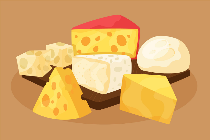 Cheese is a kind of food people make from milk. Cows, goats, or sheep give milk for it. Cheese can be yellow, white, orange. Some cheese is round, and some is in long pieces. You can eat cheese for breakfast, lunch, or dinner. People like cheese in pizza, pasta, and cakes. You can eat cheese in sandwiches or with fruit and vegetables. You can buy cheese in shops or make it home. Cheese is good for children because it them grow and keeps their teeth strong.