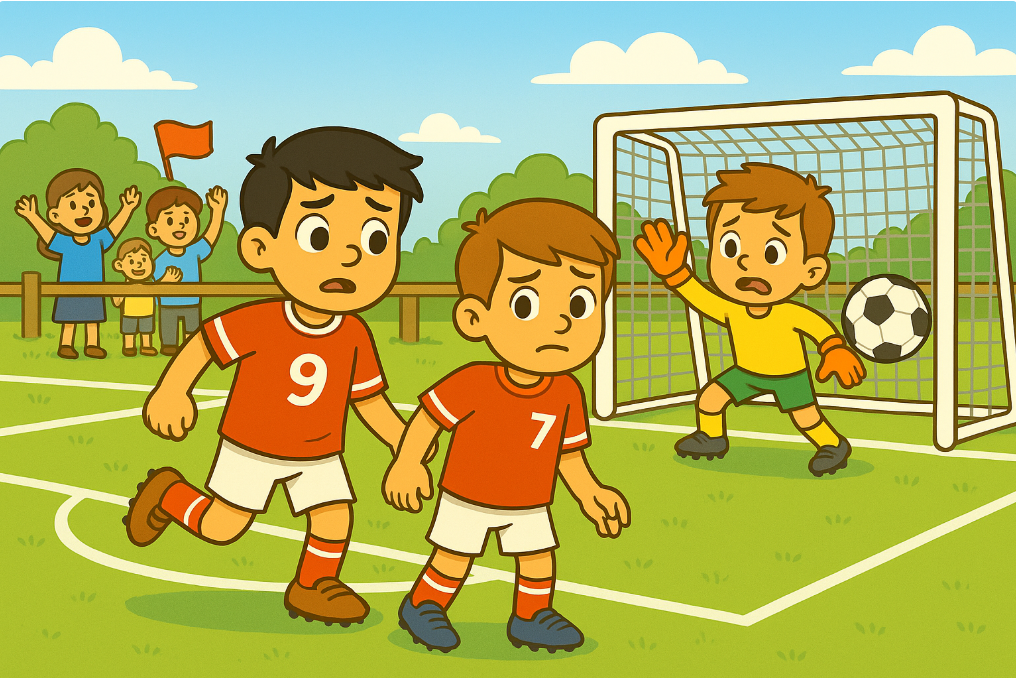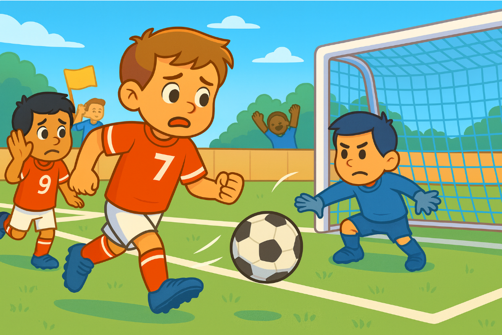 They all played their best, and soon, Peter’s team started to get better. They passed the ball quickly and worked together. Near the end of the game, the score was one-one, and both teams tried hard. Then, Peter’s friend, Paul, gave the ball to him. Peter ran quickly, and he could see the goal in front of him. He kicked the ball.