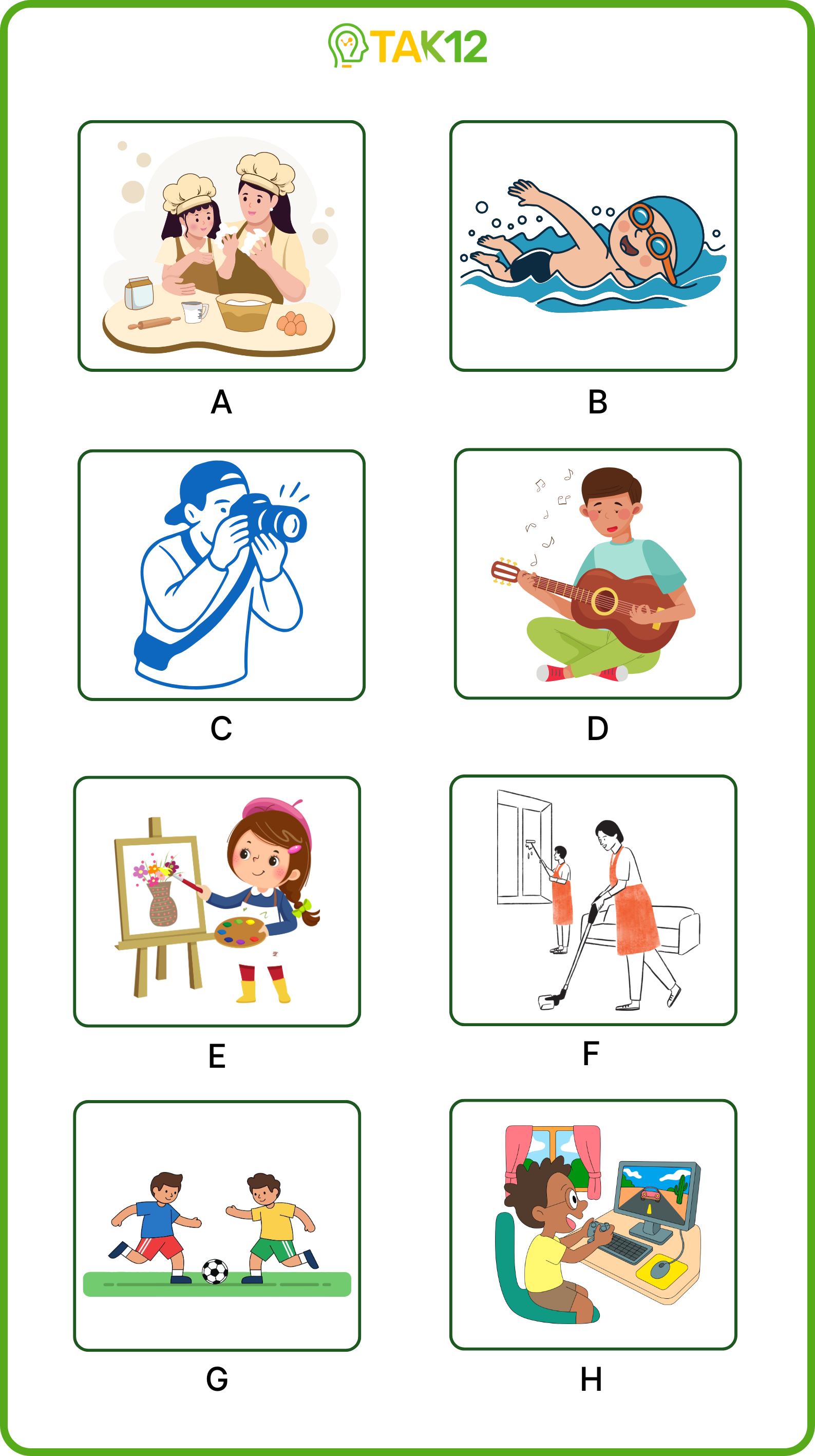 Listen and write a letter in each box. There is one example.