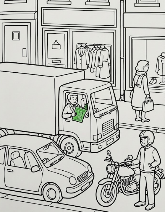 Example: Colour the newspaper that the man in the lorry is reading - green