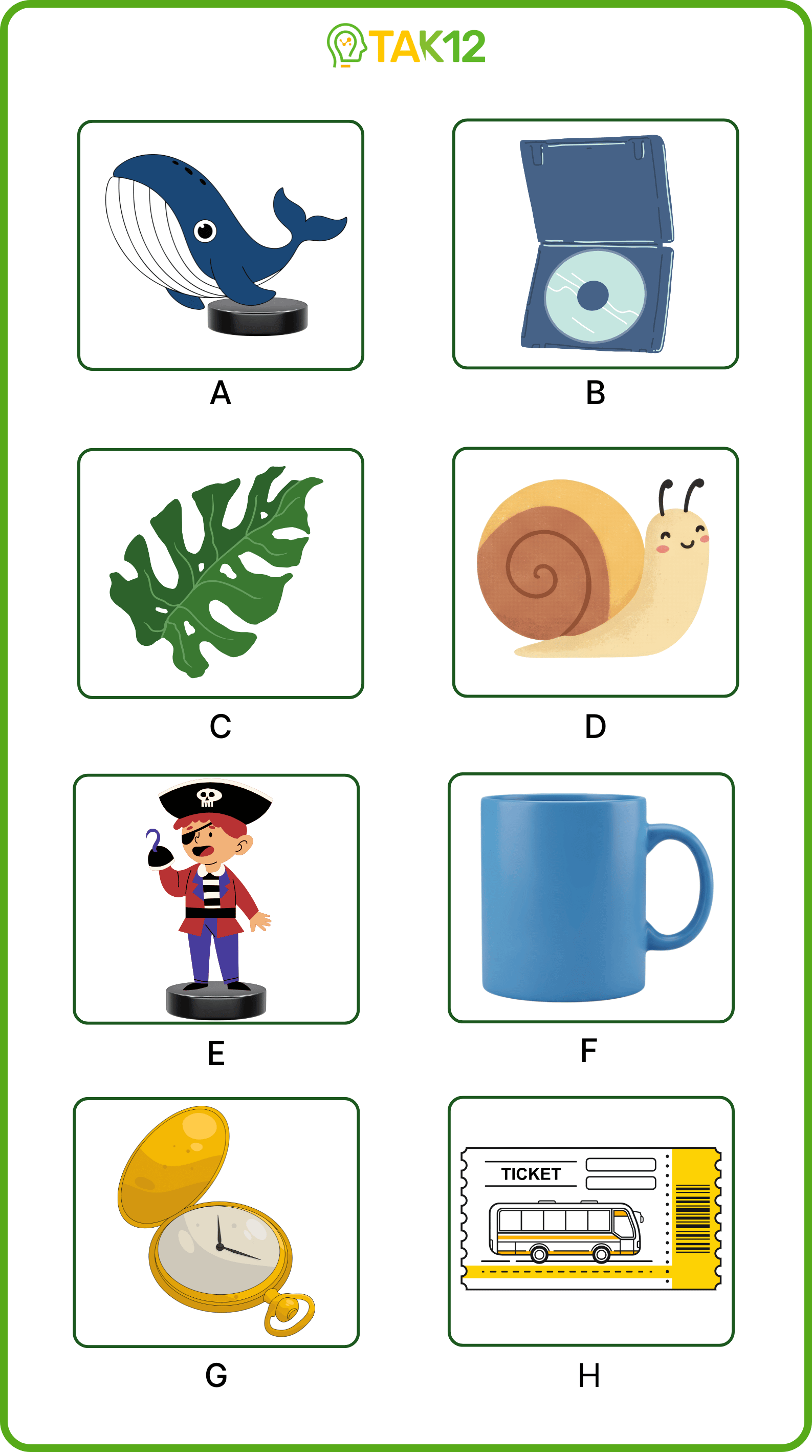 Listen and write a letter in each box. There is one example.