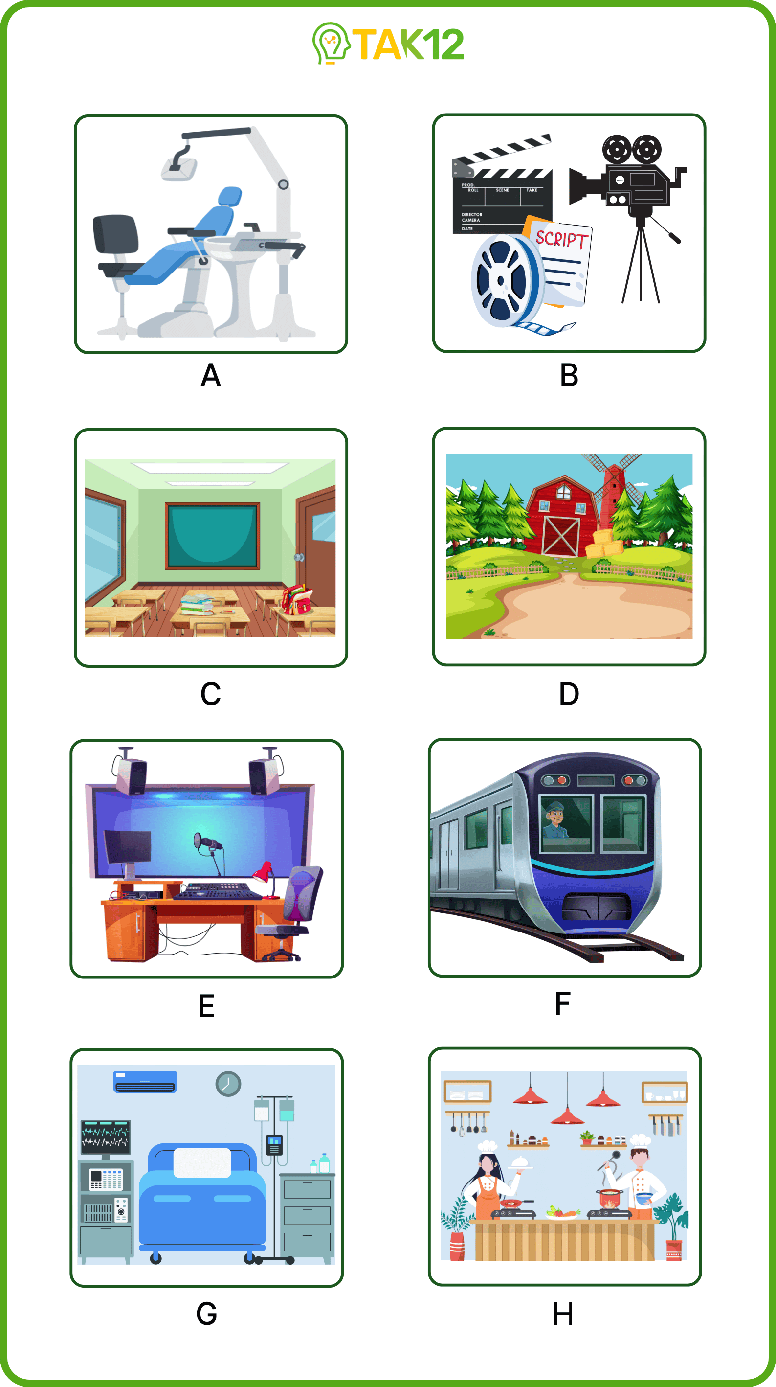 Listen and write a letter in each box. There is one example.