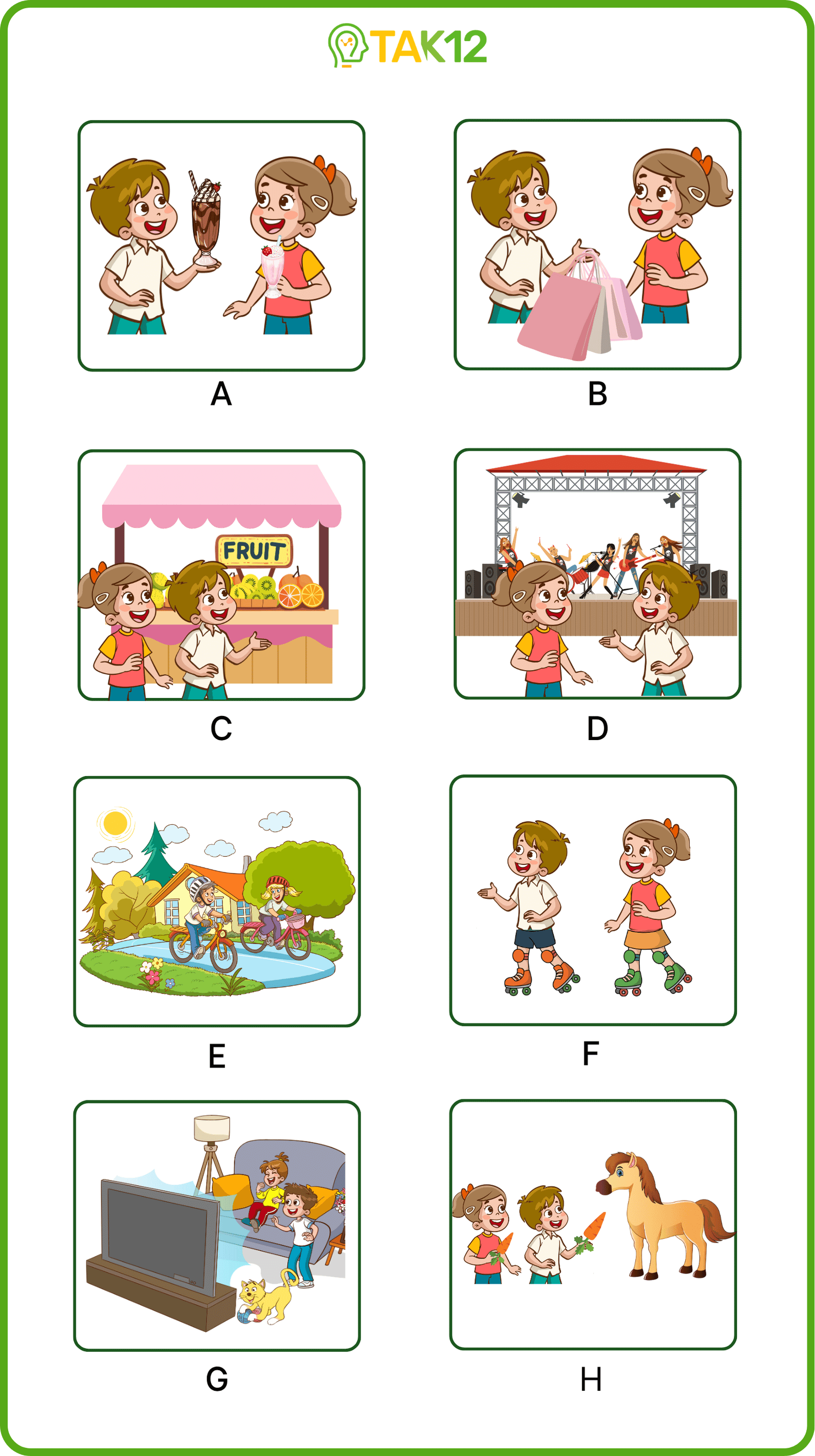 Listen and write a letter in each box. You can listen to the audio twice. There is one example.