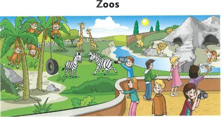 Zoos can help us to learn more ...about... our world. People go to zoos to see the animals, birds and fish come from different parts of the world. Zoos weren't always very good places for animals they sometimes had to live in small cages. Now cities in the world have a big zoo. They sometimes have long grass where animals giraffes, lions and tigers can run and play. In zoos, there are often rivers for the crocodiles to swim in. The animals think they are in the jungle - not a zoo!