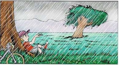 When he got tired, he sat down under a tree. It was so quiet that he fell asleep. When he woke up, it was evening. It started to rain and Tony was cold and afraid. 'I don't know what to do now,' Tony said.