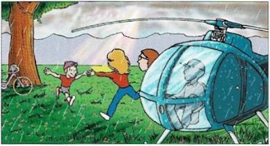 Tony waited under the tree in the cold wet weather. Then, he was surprised by a noise - it was a helicopter! It came down in the field and the door opened.