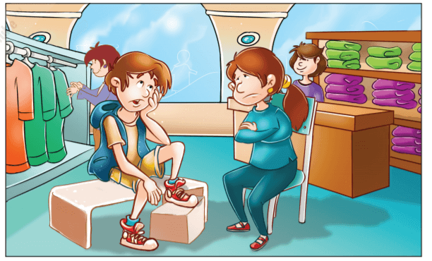 After the supermarket, Ann and her mother went to the clothes shop. There were many people in the shop. Mother said, "Ann, sit in that chair, please." Ann sat in the chair and watched the people in the shop. Ann saw a boy in the shop. Ann said, "Hello." The boy said, "Hello, I am Sam. This is boring. I don't like shopping. I want to play in the park." Ann said, "I am Ann. I like shopping. I am waiting for my mum. She is looking at the clothes here. My mum is buying beautiful clothes for me."