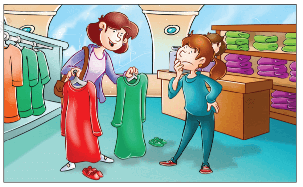 Mother said, "Ann, come here, please." Mother showed Ann two dresses and a pair of shoes for each dress. "Please pick a dress, Ann," said mother. "I like the red dress, not the green dress," said Ann. Mother bought Ann the red dress and the shoes. Ann was very happy.