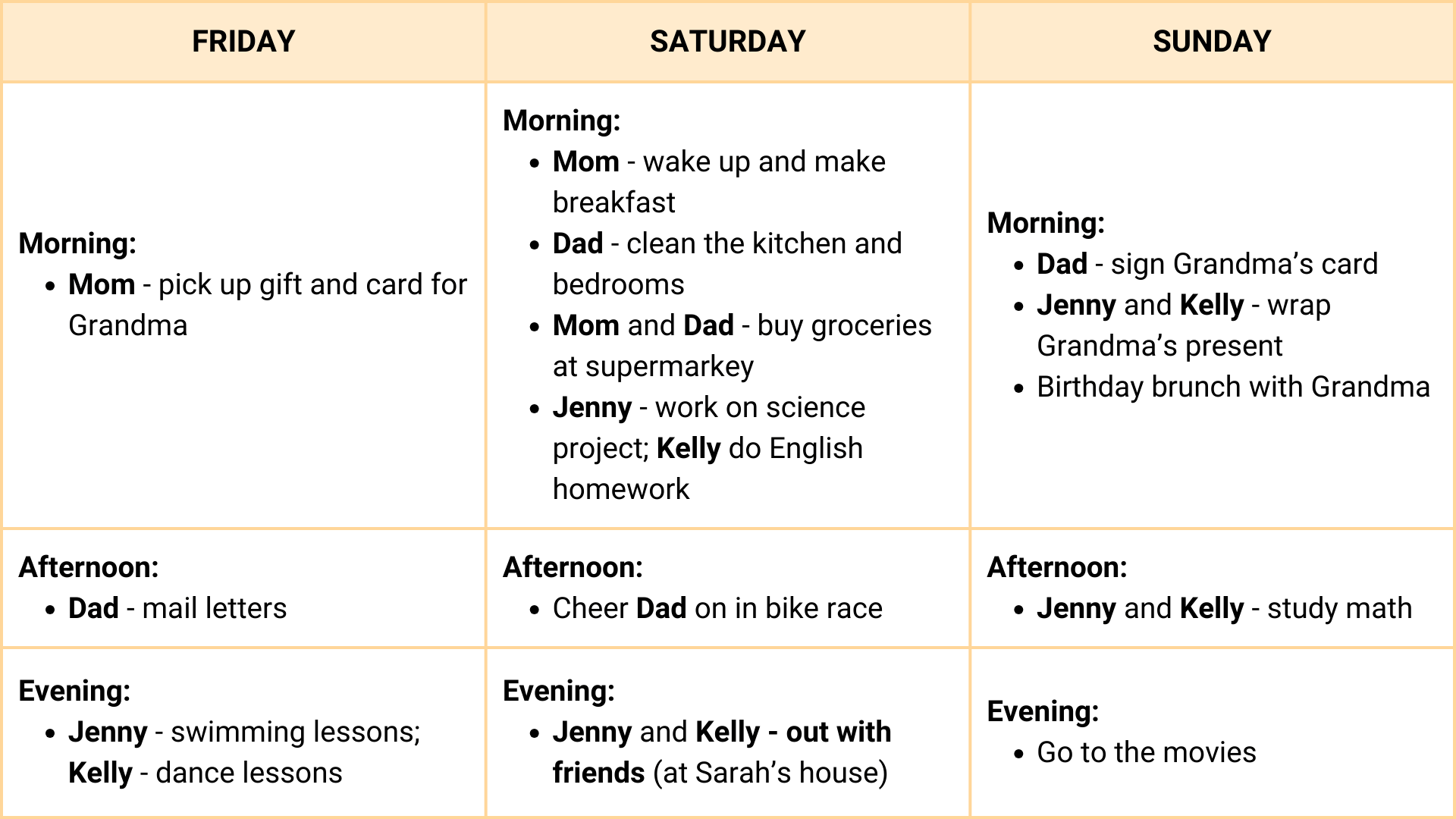 The Smith family is a busy family. They always have things to do. This weekend, they have some special plans. They will help Grandma celebrate her 80th birthday.