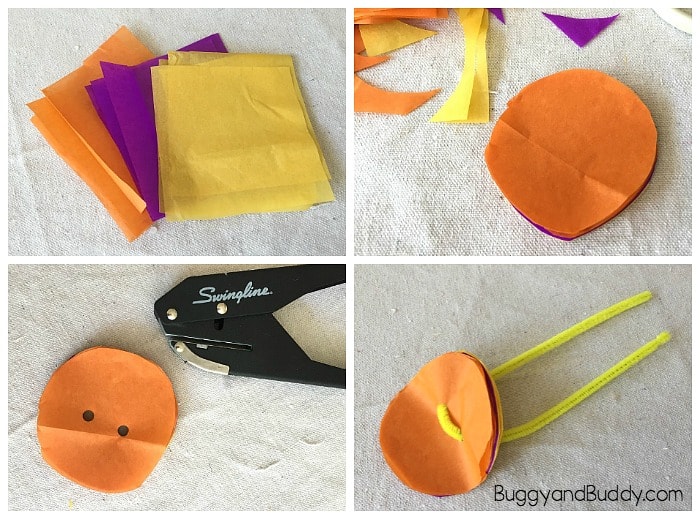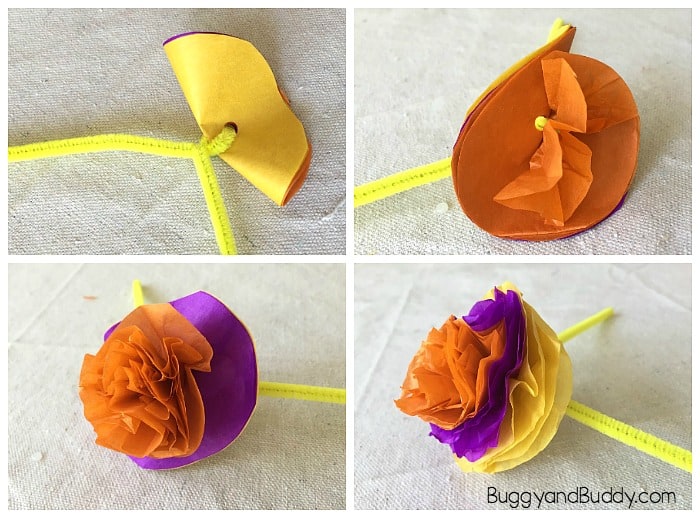 Step 5: Twist the pipe cleaner ends together right below the tissue paper circles to hold it in place.