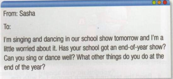 1. Read the email from your friend, Sasha. Write an email to Sasha to answer the questions. Write 25 - 35 words.