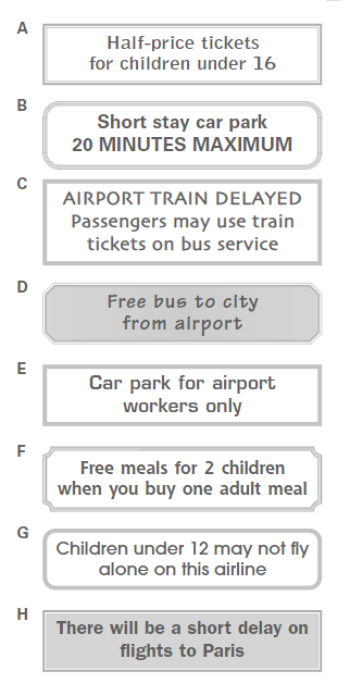 Read the conversation and choose the best answer. Write a letter (A–H) for each answer. You do not need to use all the letters.