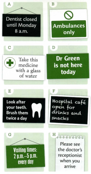 Read the conversation and choose the best answer. Write a letter (A–H) for each answer. You do not need to use all the letters.