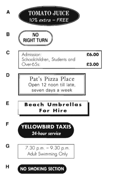 Read the conversation and choose the best answer. Write a letter (A-H) for each question. You do not need to use all the letters.