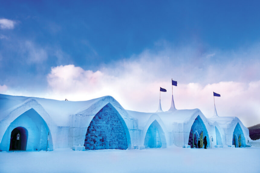 A new hotel is made every year. The hotel is carved out of ice. The hotel has about sixty rooms. All the rooms and hallways are ice. Beds and chairs are carved out of ice. People are served drinks in glasses carved from ice.