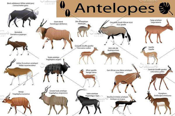 An antelope is a hoofed animal with horns that are hollow. There are many different kinds of antelope. Antelopes live in the mountains, deserts, and wetlands and are hunted by lions, hyenas, and other carnivores. They are light, quick-moving animals that can jump very well. Some antelopes can reach speeds as fast as 60 mph. They can bounce on all four legs. This is called pronking.