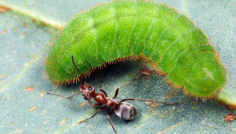 Some insect communication is more friendly. Normally ants eat caterpillars, but some caterpillars have beneficial relationships with ants. The ants protect the caterpillars. In return, the caterpillars make nectar for the ants to eat. These insects communicate in different ways. The caterpillars make sounds that the ants can hear. They release smells that tell the ants not to eat them. This helps the ants recognize which caterpillars produce nectar. Then they protect the caterpillars from being eaten by other ants!