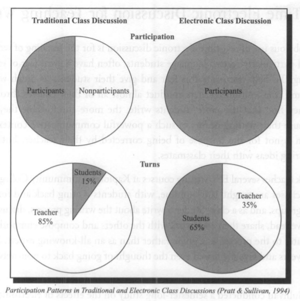 An analysis of the transcripts of large group discussions, one from each class, showed strong differences in participation patterns. Whereas only 50% of the students spoke up even once during the oral discussion, 100% of the students participated in the electronic discussion. Furthermore, in the oral discussion, the teacher took 85% of the conversational turns, whereas in the electronic discussion the teacher took only 35% of the turns.