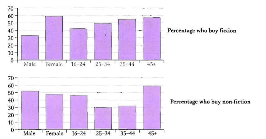 The charts below show the number and types of books bought by men and women and four different age groups in the UK. Summarise the information by selecting and reporting the main features, and make comparisons where relevant.