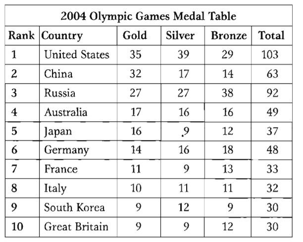 The table shows the number of medals won by the top ten countries in the 2004 Olympic Games. The USA won (1) greatest number of medals overall with a total of 103. They won (2) more silver medals as gold and (3) more medals than any other country in both categories. China had (4) the second high number of medals at 63, but unlike the USA, China won (5) less silver medals than gold medals. While Russia's silver medal total was (6) more good than China's, they did not do (7) well as China in the gold medals, winning just 27. In fact, China had a (8) more lower overall medal total than Russia but, as the table is based on the number of gold medals won, they were placed second. Similarly, Germany was (9) significantly successful at winning medals than Japan, with a total of 48 compared to Japan's 37, but because Japan won (10) two more gold medals that Germany they were ranked (11) higher. Great Britain gave (12) the worse performance in this group, winning only nine gold and nine silver medals.