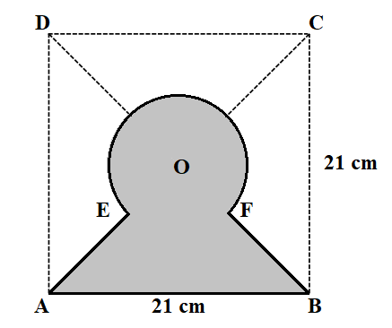 Từ một tấm bìa hình vuông cạnh 21 cm, bạn Nga cắt được một hình có dạng như hình vẽ (phần tô đậm và được bao quanh bởi đường liền nét). Biết rằng hình tròn diện tích và có tâm trùng với tâm của hình vuông. Các điểm là giao điểm của hai đường chéo hình vuông với đường tròn. Tính tổng độ dài đường viền của hình thu được (lấy và kết quả làm tròn đến hàng phần trăm).