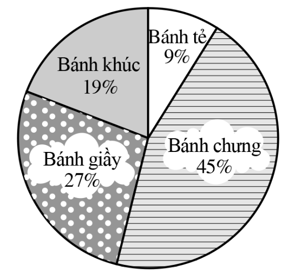 Biểu đồ hình quạt tròn dưới đây biểu diễn kết quả thống kê (tính theo tỉ số phần trăm) số lượng bánh bán được trong ngày 14/01/2023 của cửa hàng.